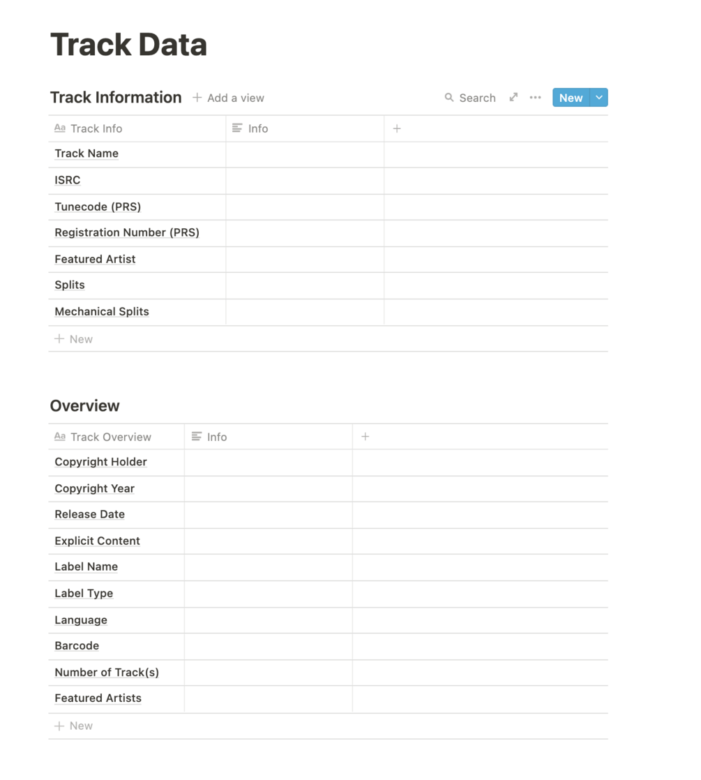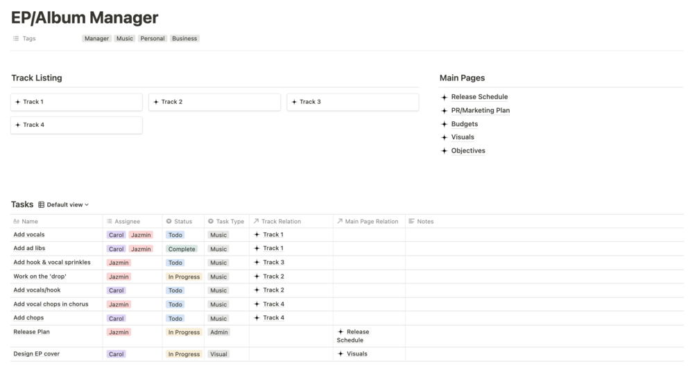 The EP/Album Manager has been designed to help independent artists manage their releases. It includes trackers and pages on: budgeting, release schedule, tasks and track data. Some areas are left blank for you to organise media and project objectives.
